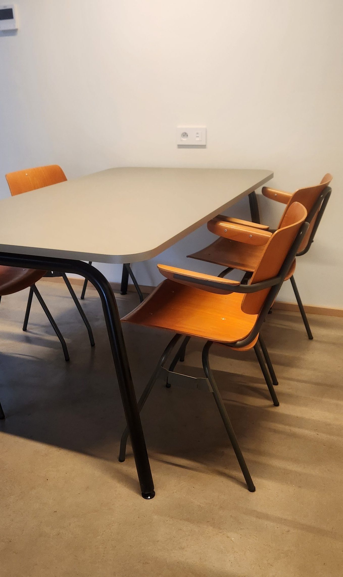 Une salle de réunion qui mêle charme brut et esprit industriel, baignée par la chaleur du bois et la sobriété de l’acier.